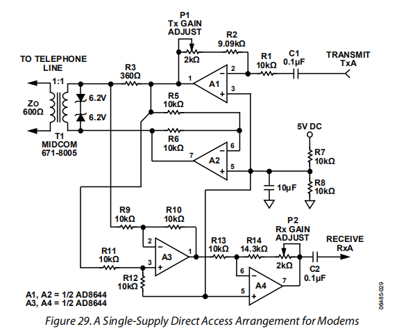图29所示为600Ω传输系统的5V单电源传输/接收电话线接口示意图。它允许在变压器耦合的600Ω线路上进行信号的全双工传输。放大器A1提供可调节的增益,以满足调制解调器的输出驱动要求。A1和A2均配置为向变压器施加最大可能的差分信号。单个5V电源的最大可用信号约为4.0V p-p,接入600Ω传输系统。放大器A3被配置为差分放大器,用于从传输线提取接收信息以通过A4放大。A3还防止发射信号干扰接收信号。A4的增益可以按照与A1相同的方式进行调整,以满足调制解调器输入信号的要求。标准电阻值允许使用单串联封装(SIP)格式的电阻阵列。将其与AD8644 14线SOIC或TSSOP封装相结合,该电路可提供紧凑的解决方案。