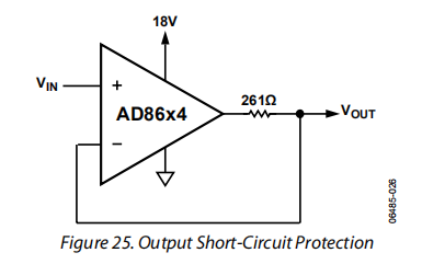 在需要一些输出电流保护,但不以降低输出电压净空为代价的应用中,可以使用与输出串联的低值电阻器。如图25所示。电阻器连接在放大器的反馈回路中,因此,如果VOUT对地短路,并且VIN摆动到18 V,则输出电流不超过70 mA。
