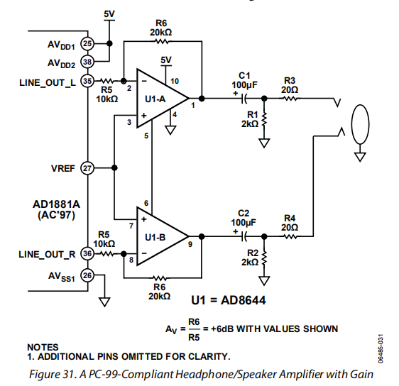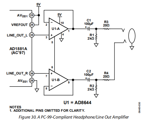 由于其高输出电流性能,AD8644是一个优秀的放大器,用于驱动计算机应用中的音频输出插孔。图30显示了如何将AD8644与ac编解码器连接以驱动耳机或扬声器。