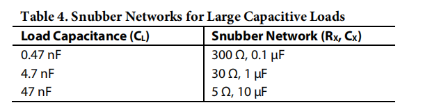 缓冲网络的最佳值应根据电容性负载的大小根据经验确定。表4显示了给定负载电容的几个缓冲网络值。