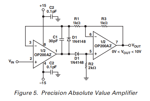 图5中的电路是一个输入阻抗为10 MΩ的精密绝对值放大器。OP200的高增益和低TCVO保证了微伏输入信号的精确操作。在这个电路中,输入总是作为共模信号出现在运算放大器上。OP200的CMR超过120db,误差小于2ppm。
