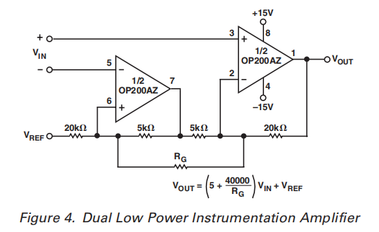图4显示了每个通道消耗功率小于33mW的双仪表放大器。从200位到100位的增益在100位到100位之间的增益比在100位到100位之间的增益好。增益大于1000 CMRR=115。在军用温度范围内,偏移电压漂移通常为0.2μV/°C,这与最好的单片仪表放大器相当。低功率仪表放大器的带宽是增益函数,如下所示: