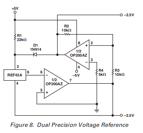 双OP200和REF43(2.5 V基准)可用于建立±2.5 V精密电压基准。在负载调节低于25μV/mA的情况下,每个基准的最大输出电流为±10 mA。线路调节优于15μV/V,输出电压漂移低于20μV/°C。0.1 Hz至10 Hz的输出电压噪声通常为75μV p-p。R1和D1确保正确启动。