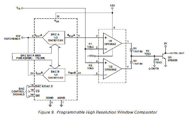 图9所示的可编程窗口比较器很容易在整个军用温度范围内达到12位精度。双CMOS 12位DAC DAC8212用于电压切换模式,以设置上下限阈值(分别为DAC A和DAC B)。