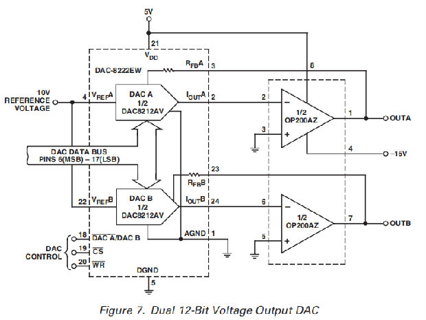 图7所示的双输出DAC能够在整个军用温度范围内提供未经修剪的12位精确操作。在军用温度范围内,OP200的偏移电压、偏置电流和增益误差占12位LSB误差的1/10。