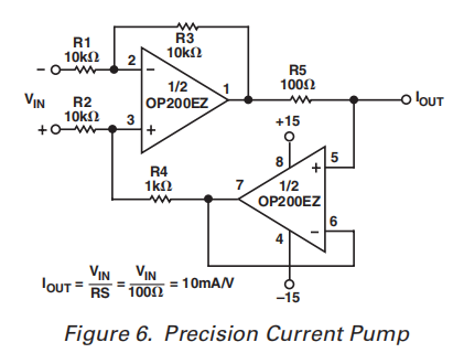 图6所示精密电流泵的最大输出电流为±10毫安。对于±15 V电源,电压合规性为±10 V。电流变送器的输出阻抗超过3 MΩ,线性度优于16位。