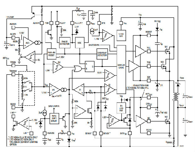 LTC®1436A/LTC1437A为同步降压驱动外部的开关调节器控制器固定相位锁定N沟道功率mosfet频率架构。自适应PowerTM输出级在频率上选择性地驱动两个N沟道mosfet高达400kHz,同时降低开关损耗高效率,低输出电流。使用外部PNP的0.5A辅助线性调节器pass器件提供低噪声、低电压差来源。二次绕组反馈控制引脚(SFB)无论主负载如何,都能保证调节通过强制连续操作输出。一个额外的比较器可用作低电池检测器。包括上电复位定时器(POR)产生延迟65536/fCLK(300ms)的信号通常)当输出在规定值的5%以内时输出电压。内部电阻分压器提供引脚可选择的输出电压具有远程感应能力。用户可通过外部电流检测电阻器。宽输入电源范围允许在3.5V至30V(最大36V)范围内工作。