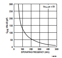 图中给出了选择COSC与频率的关系图2随着工作频率的增加,栅极电荷损耗会更高,降低效率(参见效率考虑)。建议的最大值开关频率为400kHz。当使用图2可同步应用,选择COSC对应于低于中心30%的频率频率。(参见锁相环和频率同步。)