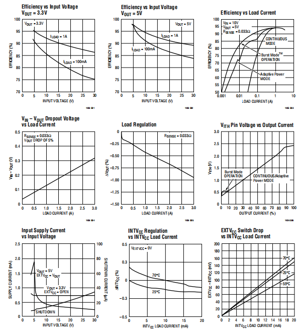 INTVCC:内部5V调节器和EXTVCC的输出开关。驱动器和控制电路由这个电压。必须与电源接地紧密解耦含至少2.2μF钽或电解电容器。底部MOSFET驱动电源电压。