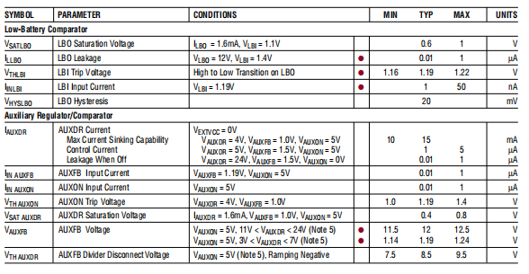 AUXFB:辅助调节器的反馈输入/比较器。当用作线性调节器时,此输入可以连接到外部电阻分压器或直接连接到外部PNP传递设备的收集器12V操作。当用作比较器时,它是反向输入的比较器的非可逆输入连接到内部1.19V参考电压。见辅助应用信息部分的调节器/比较器。