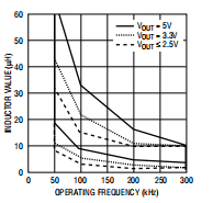 接受较大的∆IL值允许使用低电感,但会导致更高的输出电压纹波以及更大的核心损失。一个合理的起点整定纹波电流为∆IL=0.4(IMAX)。记住,那个最大∆IL出现在最大输入电压下。电感值对低电流也有影响操作。开始向低电流运行过渡当电感器电流达到零而底部MOSFET开启。较低的电感器值(较高的∆IL)将在较高的负载电流下发生这种情况在低电流的上限范围内导致效率下降操作。在突发模式操作中(TGS引脚打开),较低的电感值将导致突发频率减少。图3给出了建议的感应值与工作频率和电压的范围