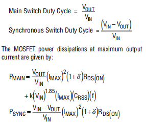 必须选择三个外部功率mosfet对于LTC1436A/LTC1437A:一对用于顶部(主)开关的N沟道MOS FET和一个N沟道MOSFET用于底部(同步)开关。为了利用自适应功率输出级,两个必须选择上部模块MOSFET。A大(低RSD(开))MOSFET和一个小型(RDS(ON))MOSFET是必修的。采用大型MOSFET作为主开关与同步开关配合工作。较小的MOSFET仅在低负载下启用当前状况。这提高了中电流效率同时继续以恒定频率工作。同时,通过使用小型MOSFET电路可以保持恒定在循环之前,频率运行降低到较低的电流发生跳转。小型MOSFET推荐的RDS(ON)是约0.5Ω。注意不要使用带有RDS(ON)太低;记住,我们要保存门电荷。(更高的RDS(ON)MOSFET具有更小的栅极电容,因此需要较少的电流来充电门)。对于成本敏感的应用,小型MOSFET可以移除。然后电路将开始突发模式负载电流下降时的操作。峰间栅极驱动电平由INTVCC设置电压。启动期间,该电压通常为5V(参见EXTVCC引脚连接)。因此,逻辑层大多数LTC1436A必须使用阈值MOSFET/LTC1437A应用。唯一的例外是应用程序其中EXTVCC由外部电源供电大于8V(必须小于10V),其中哪个标准可使用小于4th的[VGS]。结清注意MOSFETs as的BVDSS规范很多逻辑电平的mosfet限制在30V或者更少。功率mosfet的选择标准包括“ON”电阻RSD(ON),反向转移电容CRS,输入电压和最大输出电流。当LTC1436A/LTC1437A以连续模式运行顶部和底部mosfet的占空比为:
