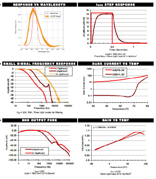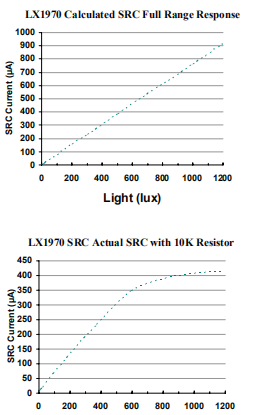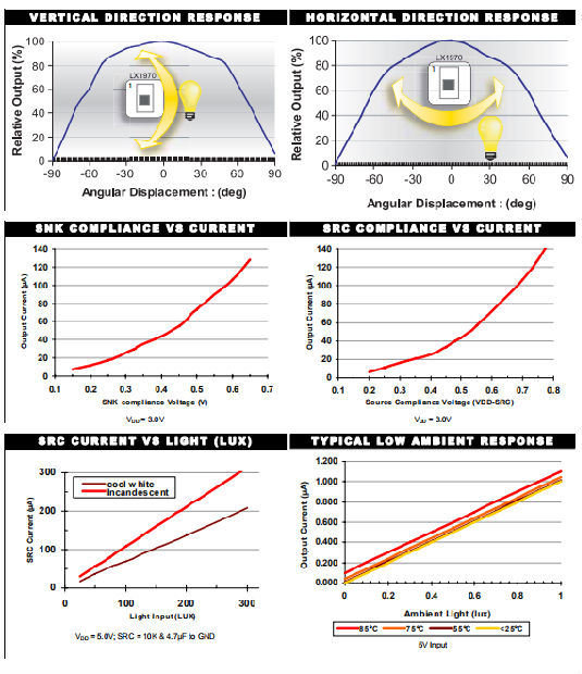 LX1970是一种具有光谱响应的光传感器就像人类的视觉系统。它包装在清除MSOP包。Microsemi还提供LX1971具有相同的引脚输出和类似的电源电压范围LX1970光传感器。LX1971响应能力但与LX170不同。一般来说LX1971灵敏度低,动态范围宽。LX170的响应能力与光照在照片上的强度成正比受体。虽然增益取决于一般来说,光的波长和方向绿色(5nm)灵敏度为黄色,波长为:L<1200勒克斯时,IOUT=L×0.76μALX1970最适合于光传感器是连续照明的组成部分控制系统。例如,在LCD背光应用时,背光的亮度等级应根据环境照明水平进行调整;LX170可提供闭环亮度控制这种类型的系统。对于大多数室内应用,1200勒克斯饱和点的lx170通常不是一个限制影响。LX1971最适合于系统必须响应影响用户看得清楚的能力。例如,要转动的传感器在前照灯或传感器上调整后视镜的反射率后视镜。这些系统要求传感器动态范围与视线相似。就像人眼一样LX1971的平方根函数使其变得格外敏感在较低的光照下发生微小的变化。广泛的动态范围允许LX1971感知黄昏和日光或阳光和浓密的云层。第一条曲线显示了基于公式的LX1970无负载电阻以上。它可以作为基线指南来计算增益设定电阻器。当前来源的合规性输出可能导致输出过早饱和当增加负载电阻时。SRC合规性电压通常规定为VDD-350mV@约100勒克斯。第二条曲线显示输出饱和VIN=5V和10K电阻SRC接地,高于300uA开始时,输出变为非线性浸透。