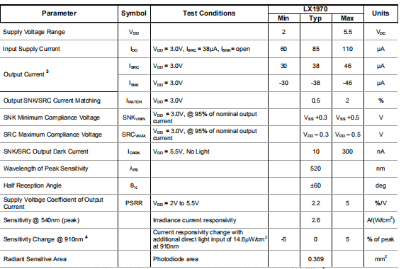 除非另有规定,以下规范适用于工作环境温度-40°C≤TA≤85°C,VDD=2V至5.5V,负载=50Kohms,直接光输入2为14.6μW/cm2