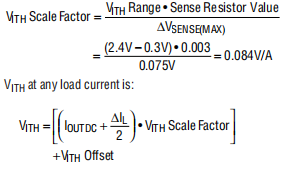 在第i个引脚的最佳电阻值下,输出电压从最小负载时的1.55V到1.44V满载时。在该输出电压下,有源电压位置为输出电容器上的允许传输电压提供了额外的±56mV,比没有有源电压时允许的±82mV提高了68%定位。下一步是计算VITH的比例因子第i个引脚电压。第八个比例因子反映第i个引脚给定负载电流所需的电压。维生素控制峰值感应电阻电压,代表直流电输出电流加上半个峰间电感电流。空载至满载范围为0.3V至2.4V,将感测电阻电压从0V控制到75毫伏的∆VSENSE(最大)电压。计算出的维生素带有0.003Ω感应电阻器的比例因数为: