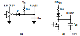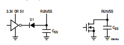 图5中的二极管D1减少了启动延迟,同时允许CSS为软启动功能缓慢充电。这个如果不需要软启动,可以删除二极管和CSS。RUN/SS引脚有一个内部6V齐纳钳(参见功能图)。