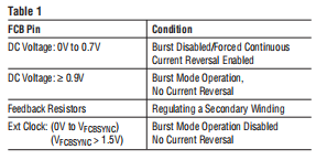 如果VSEC下降到这个水平以下,FCB电压强制持续切换操作,直到VSEC再次高于它的最小值。为了防止在未对FCB引脚进行外部连接的情况下出现异常操作,FCB引脚的电流为0.17μa内部电流源将引脚拉高。记住选择电阻值R3时,包括该电流和R4。内部LTC1735振荡器可与通过应用和时钟FCB引脚的外部振荡器当a.V以上信号与a.V.1同步时外部频率,突发模式操作被禁用,但是在低负载电流下,由于电流禁止反转。底部的门每10个时钟周期,以确保引导帽保持新鲜。外部时钟的上升沿应用于FCB引脚开始一个新的循环。不得驱动FCB销当设备处于关机状态时(RUN/SS引脚低)。同步范围从0.9fO到1.3fO,其中COSC设置的fO。试图同步一个更高的频率超过1.3fO会导致斜率补偿不足,并在高占空比下导致环路不稳定(占空比>50%)。如果在同步的,额外的斜率补偿可以通过简单地降低COSC来获得。下表总结了FCB引脚上可用的可能状态:
