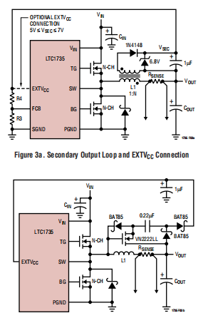 3.EXTVCC连接到输出派生的boost网络。对于3.3V和其他低压稳压器,效率提高仍然可以通过将EXTVCC连接到一个输出电压,该电压已经被提升到大于4.7伏。这可以通过感应式升压来实现绕组如图3a所示或电容性电荷泵如图3b所示。充电泵具有简单磁学的优点。