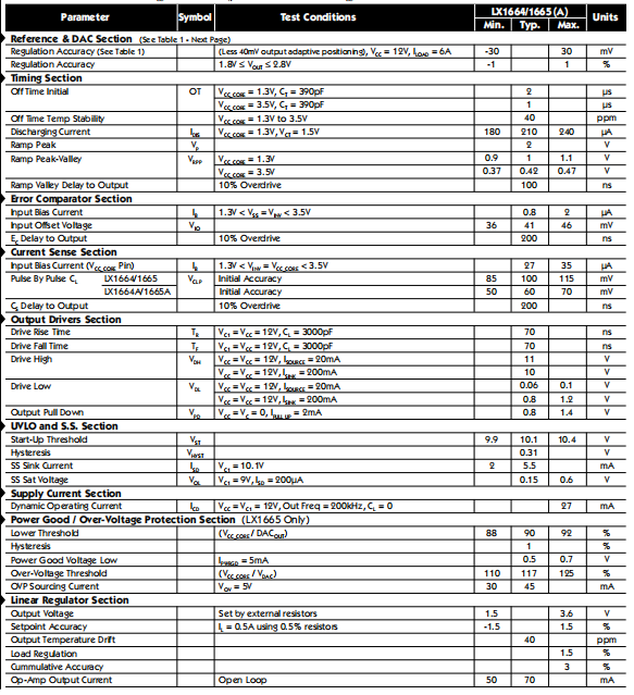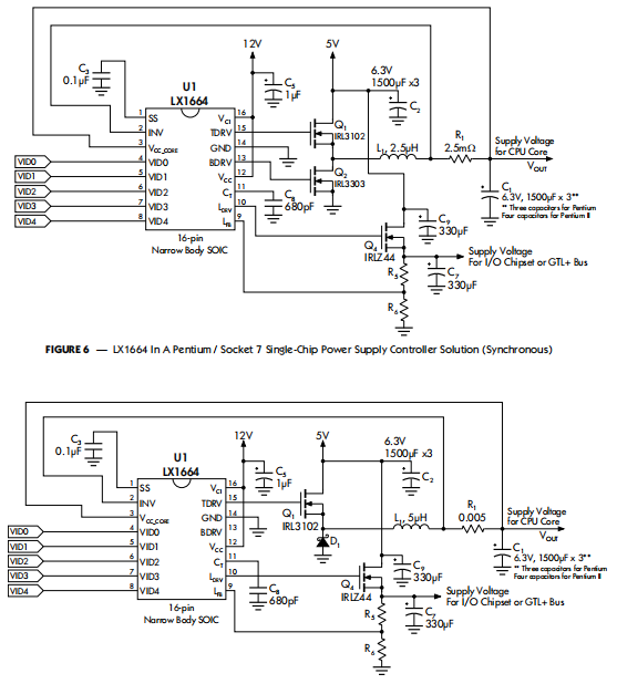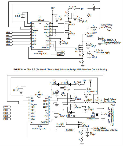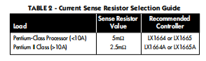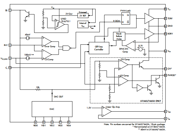 当感应到的电压与负载电流,超过电流检测比较器阈值价值观。电流可以通过使用固定感测器来感应与电感器串联的电阻引起电压降通过使用电容器和电流成比例与电感并联的电压降电感器的寄生电阻。LX166x系列提供两种不同的比较阈值。LX1664和1665的阈值为100毫伏,而LX1664A的阈值为100毫伏LX1665A的阈值为60毫伏。60毫伏阈值为更适合更高电流负载,如奔腾II或说明处理器。