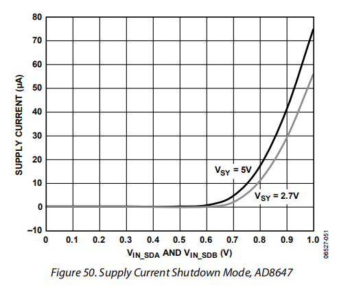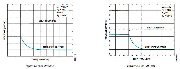 AD8647的关闭功能与运算放大器的负电源电压有关。逻辑电平高(>2.0V)启用器件,而逻辑电平低(<0.8V)使器件失效,并使输出处于高阻抗状态。几个输出可以有线或'连接,从而消除了多路复用器。逻辑输入是高阻抗CMOS输入。如果使用双电源或分体式电源,逻辑信号必须正确参考负电源电压。