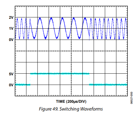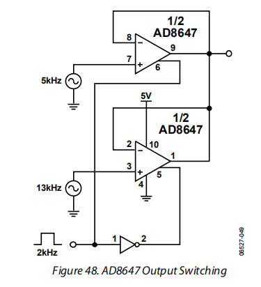 因为每个运算放大器都有一个单独的逻辑输入启用引脚,如果可以保证任何时候只有一个运算放大器是活动的,那么输出可以连接在一起。如图48所示,通过连接运算放大器,可以消除多路复用器。在合理缩短开关时间的情况下,可以平滑地选择低频信号路径。关闭时间略快于开启时间,因此,即使使用来自两个不同包的部分,重叠也小于300纳秒。