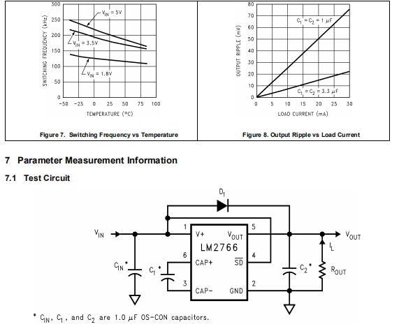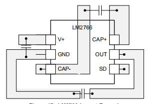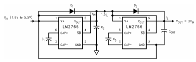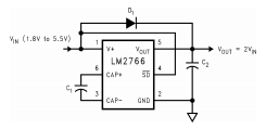 LM2766 CMOS电荷泵电压转换器用作电压范围为1.8V至5.5V。此电路使用两个低成本电容器和一个二极管(启动时需要)。