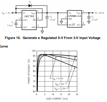 可以使用低压差调节器(例如LP2980-5.0)来调节LM2766的输出。这个整个转换器如图15所示。使用LP2980-3.3、LP2980-3.0或LP2980-ADJ可以获得不同的输出电压。最坏情况设计必须同时满足以下条件:
