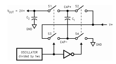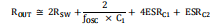 这种电路的输出特性可以用一个理想的电压源和一个抵抗。电压源等于2 V+。输出电阻路径是内部MOSFET开关,振荡器频率,C1和C2的电容和ESR。因为开关电流充放电C1大约是输出电流的两倍,ESR的影响抽运电容器C1在输出电阻中乘以4。输出电容器C2正在充电并且放电电流约等于输出电流,因此,其ESR只在输出电阻。ROT的一个很好的近似值是: