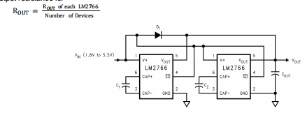 任何数量的LM2766器件可以并联,以减少输出电阻。因为没有封闭的回路反馈,正如在调节电路中发现的那样,稳定的运行是有保证的。每个设备都必须有自己的抽运电容器C1,而只需要一个输出电容器,如图13所示。复合材料输出电阻为: