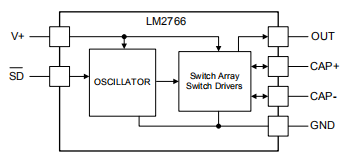 LM2766提供了一种简单而有效的方法来产生等于输入电压。在不需要电感器的情况下,应用解决方案的尺寸可以比磁性材料小DC-DC转换器解决方案。