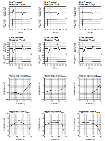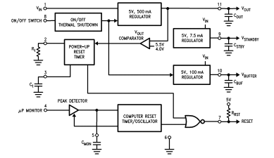 备用输出用于需要备用存储电路。而大电流调节器输出由后面描述的ON/OFF引脚控制,在所有条件下,只要为IC提供足够的输入电压。因此,由该输出供电的存储器和其他电路不受正线路瞬变、热关机等影响。备用稳压器电路的设计使得当另一个调节器输出关闭。这种调节器输出端的电容器可以不受限制地增加。这将有助于保持输出负输入瞬变期间的电压也有助于降低所有三个输出的噪声。因为另一个双轨备用输出:因此任何噪音降低这也将降低另外两个噪声电压。