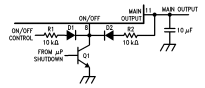 另一种可能的方法是使用二极管串联接通/断开信号和另一个与主输出串联的信号,以便在以后的一段时间内保持电源开/关信号已被移除(见图1)。接通/断开开关最初通过二极管D1拉高,主输出将接通并通过二极管供电D2至ON/OFF开关,有效锁定主输出。开路集电极晶体管Q1连接到ON/OFF引脚以及两个二极管,并在mP确定的一段时间后强制调节器关闭。在这个这样,mP可以覆盖掉掉电命令并存储在返回到待机模式
