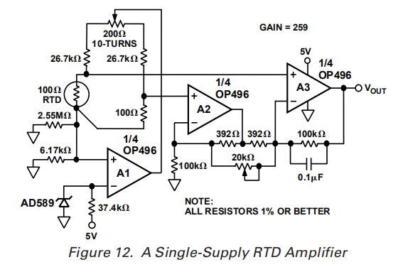 在一个操作电路中,由一个4 9安培的操作放大器产生一个电压为4 9伏的单电源。该电路利用OP496的宽输出摆幅产生3.9v的桥激励电压,AD589为桥电流提供1.235v参考电压。运算放大器A1驱动桥保持6.19 kΩ和2.55 MΩ电阻器,可产生200μa电流源。这股水流均匀地分流,流过桥的两半部分。因此,100μA流过RTD产生与其电阻成比例的输出电压。为了提高精度,建议使用3线电阻式温度检测器来平衡电桥两个100Ω支腿的线路电阻。