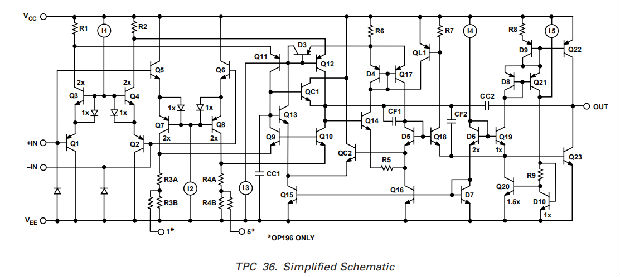 OP196系列运算放大器由单电源、微功率、轨对轨输入和输出放大器组成。输入偏移电压(VOS)最大值仅为300μV,而输出将为负载提供±5 mA。电源电流仅为50μA,带宽超过450 kHz,转换率为0.3 V/μs。TPC 36是OP196的简化示意图,它显示了实现此性能所使用的新颖电路设计技术。