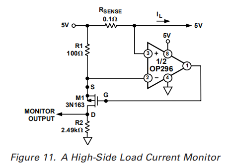 在电源控制电路的设计中,大量的设计工作集中在确保通流晶体管在广泛的负载电流条件下的长期可靠性。因此,在这些设计中,监控和限制设备功耗是最重要的。图11中所示的电路是一个5V单电源高压侧电流监测器的示例,该监测器可并入具有可折叠限流功能的电压调节器或具有撬杆保护的大电流电源的设计中。该设计使用了一个OP296的轨道环行输入电压范围来检测通过0.1Ω电流分流器的电压降。该电路采用p沟MOSFET作为反馈元件,将运算放大器的差分输入电压转换为电流。然后将该电流施加到R2,以产生一个电压,该电压是负载电流的线性表示。电流监测器的传输方程如下: