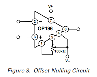 OP196提供两个偏移调整端子,可用于使放大器的内部VO归零。一般来说,运算放大器端子不应用于调整系统偏移电压。建议使用100 kΩ电位计,如图3所示连接,以使OP196的偏移电压为零。偏置调零不会对TCVOS性能产生不利影响,前提是微调电位器温度系数不超过±100 ppm/°C。