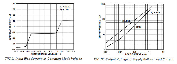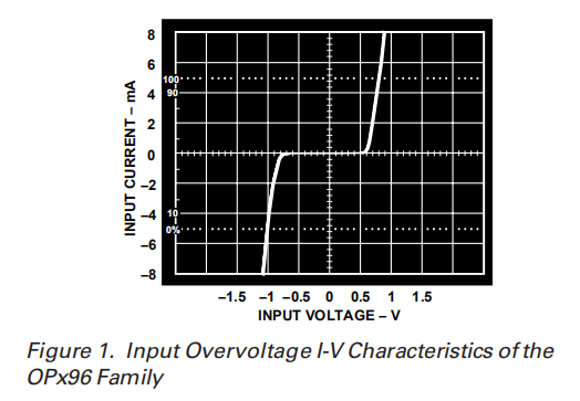 图1显示了OPx96系列的输入特性。这张照片是由连接到地面的电源引脚和连接到输入的曲线跟踪器的收集器输出驱动器生成的。如图所示,当输入电压超过任一电源0.6V以上时,内部pn结通电并允许电流从输入流到电源。如果电流不受限制,放大器可能损坏。为防止损坏,输入电流应限制在不超过5毫安。