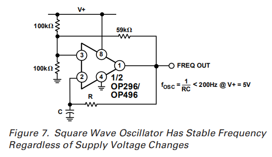 图7中的振荡器电路演示了轨对轨输出摆幅如何降低电源变化对振荡器频率的影响。此功能在电池供电的应用程序中特别有价值,在这些应用程序中,电压调节可能不可用。当电源电压变化时,输出频率保持稳定,因为由轨对轨输出产生的RC充电电流与电源电压成比例。由于施密特触发阈值电平也与电源电压成比例,因此频率保持相对独立于电源电压。当电源电压从9V变为5V时,输出频率仅变化约4Hz。放大器的转换率将振荡频率限制在5V的电源电压下的最大值约200Hz。