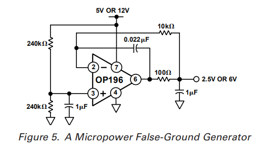 一些单电源电路在输入电压高于地面时工作最佳,通常为电源电压的1/2。在这些情况下,可以通过使用放大器缓冲的分压器来产生假接地。一个这样的电路如图5所示。