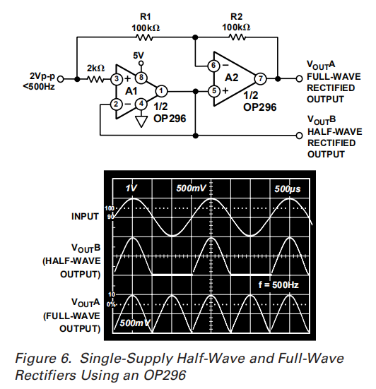 OP296被配置为从单个电源操作的电压跟随器,可在低频(<400hz)应用中用作简单的半波整流器。全波整流器可以配置一对OP296,如图6所示。