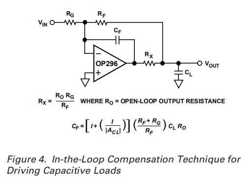 OP196系列放大器无条件稳定,电容负载小于170pf。在图4所示的驱动技术中,电容性负载的驱动技术如图4所示。