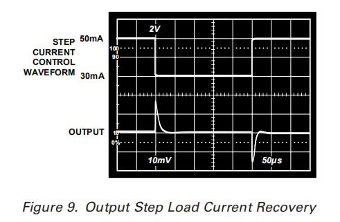 图9显示了调节器的恢复特性,当其输出经历20毫安到50毫安的阶跃电流变化时。