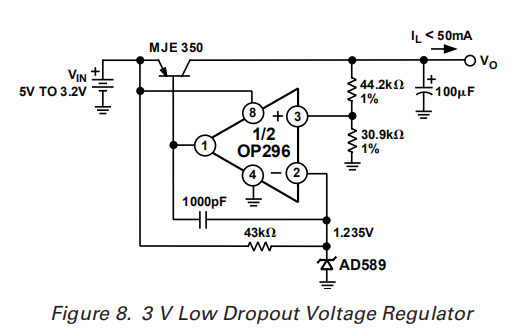 AD589为调节器提供1.235V参考电压。OP296以2.43的不可逆增益运行,驱动MJE350的基极产生3.0 V的输出电压。由于MJE350在逆变(公共发射极)模式下工作,输出反馈应用于OP296的非转换输入。