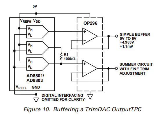 多通道TrimDACs®如AD8801/AD8803,广泛用于数字调零和类似应用。这些DAC具有轨间输出摆动,标称输出电阻为5KΩ。如果需要较低的输出阻抗,可以添加一个OP296放大器。图10显示了两个示例。OP296的一个放大器用作一个简单的缓冲器,以降低DAC a的输出电阻。OP296提供轨对轨输出驱动,同时工作电压降至3v,只需要50μa的电源电流。