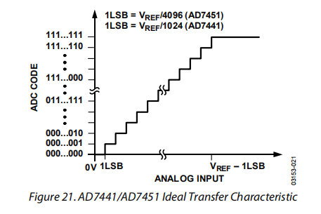 AD7441/AD7451的输出编码是直接(自然)二进制的。设计的代码转换在连续的LSB值(1lsb、2lsb等)下发生。AD7451的LSB大小是VREF/4096,AD7441的LSB大小是VREF/1024。AD7441/AD7451的理想传输特性如图21所示。