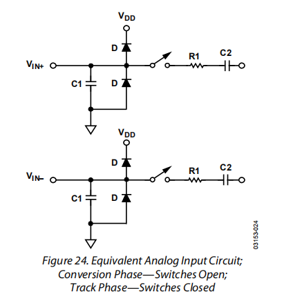图24显示了AD7441/AD7451模拟输入结构的等效电路。四个二极管为模拟输入提供ESD保护。必须注意确保模拟输入信号不会超过电源轨300毫伏以上。这导致这些二极管正向偏压并开始传导到基片中。这些二极管可传导高达10毫安,而不会对零件造成不可逆转的损坏。C1电容器(见图24)通常为4 pF,主要归因于管脚电容。电阻器是由开关的导通电阻组成的集中元件。这些电阻器的值通常约为100Ω。C2电容器是ADC采样电容器,通常具有16 pF的电容。