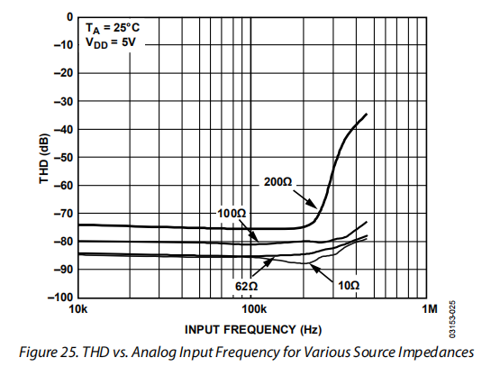 图25显示了不同源阻抗下THD与模拟输入信号频率的关系图。