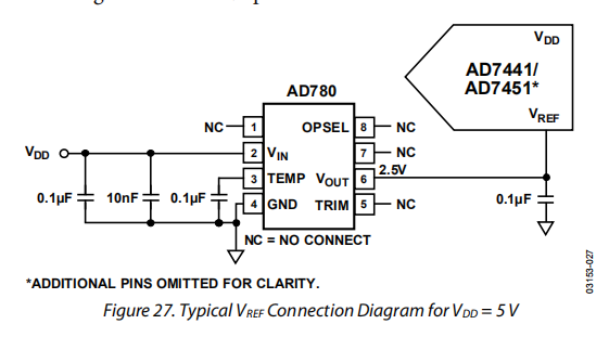需要外部电源为AD7441/AD7451提供参考。该参考输入的范围从100毫伏到VDD。对于2.7 V至5.25 V的电源,规定的参考电压为2.5 V。为应用选择的参考输入不得大于电源。参考源中的误差会导致AD7441/AD7451传输函数中的增益误差,并增加部件的指定满标度误差。VREFpin上必须放置至少0.1μF的电容器。AD7441/AD7451的合适参考源包括AD780和ADR421。图27显示了VREF引脚的典型连接图。