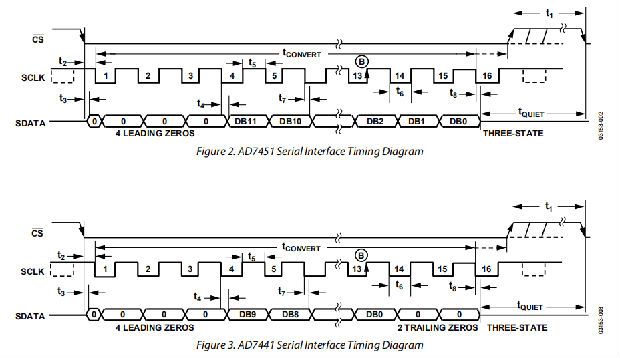 图2和图3分别显示了AD7451和AD7441串行接口的详细时序图。串行时钟提供转换时钟,并在转换期间控制来自设备的数据传输。