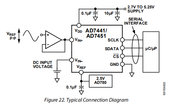 AD7441/AD7451具有伪差分模拟输入。VIN+输入与信号源耦合,必须具有vp-p的振幅,以利用部件的整个动态范围。直流输入被施加到VREF上。施加到该输入上的电压为VIN-输入提供一个接地偏移或伪接地。伪差分输入将模拟输入信号地与ADC地分开,允许取消直流共模电压。